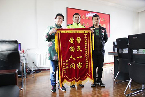 10月10日,伤者的家属带着一面锦旗来到了平山大队,伤者的儿子看到大队长冯林激动地说:“谢谢冯大队在百忙之中,这么细致地救助我的父亲,由于您的及时救助,我父亲才得以最快地送到医院救治,目前,我的父亲已无大恙,他特意让我转告您,谢谢您,谢谢平山大队的交警!”