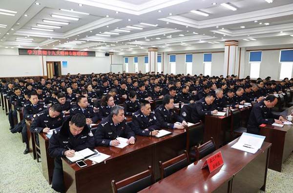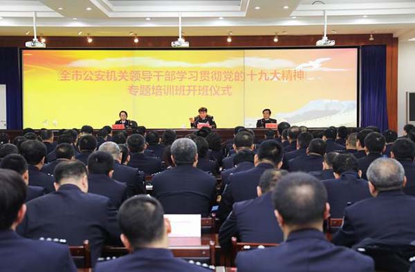 为深入学习贯彻党的十九大精神,深刻理解领会习近平新时代中国特色社会主义思想,进一步增强“四个意识”,坚定“四个自信”,切实把思想统一到党的十九大精神上来,把各项公安工作凝聚到党的十九大确定的各项任务上来,1月17日,市局政治部组织召开全局领导干部学习贯彻党的十九大精神第一期集中培训班,全局处级领导干部;各分县局、警种部门的政委、政治处主任、政治协理员;以及市局政治部、改革办全体人员参加了本次培训。开班仪式由常务副局长郭振斌同志主持,市局党委委员、政治部主任杨丽娟同志对本次学习提出了具体要求,副市长、公安局长王会奇同志做了重要讲话,省委党校副校长周永生教授围绕深入贯彻党的十九大精神作专题辅导。