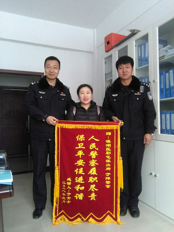 2018年3月26日上午,于某专程来到彩屯公安派出所对彩屯派出所的民警表示感谢,她还送来一面锦旗,上面写着“人民警察履职尽责,保卫平安促进和谐”,她握着彩屯派出所教导员李志扬的手说,“真的特别感谢于洋警长,特别感谢彩屯派出所培养出了这么体恤百姓的人民警察”。