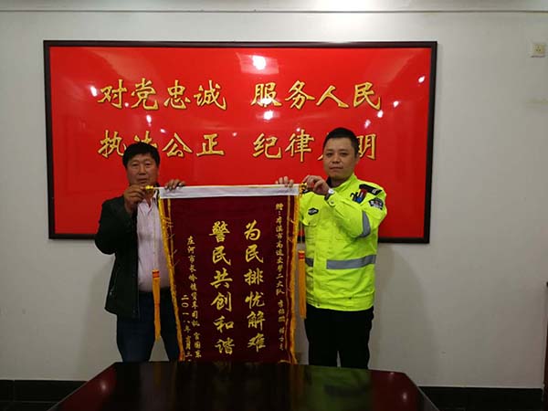 21日,两位民警还象往常一样紧张忙碌地工作了一个上午,当他们中午回到大队的时候,早早等在大队接待室的宫国东先生手捧一面锦旗迎在他们面前,上书:为民排忧解难警民共创和谐。