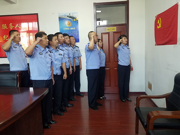 为纪念中国共产党成立97周年,深入学习贯彻习近平总书记中国特色社会主义政法思想,充分发挥党组织的政治优势和组织优势,自觉践行“对党忠诚、服务人民、执法公正、纪律严明”的四句话总要求,奋力开创新时代本溪公安工作新局面。6月29日,本溪市社区警务支队党支部组织全体党员开展主题为“践行新思想、担当新使命”的重温入党誓词活动。面对鲜红党旗,全体党员庄严举起右手,重温入党誓词,仪式庄严、誓词铿锵,进一步坚定了牢记入党誓词、终身为党奋斗的信念决心。